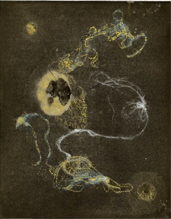 Image: Susan Aldworth, Modern-Alchemy 10a. Etching, aquatint and monotype with gold leaf, 2023.